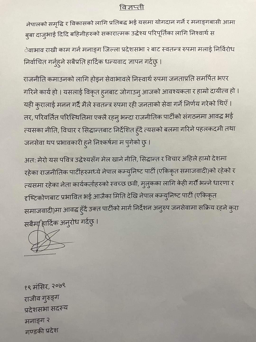 मनाङे पार्टी प्रवेश गरेसँगै गण्डकी प्रदेशसभामा प्रत्यक्षतर्फ एकीकृत समाजवादीको एक सिट भएको छ । यसअघि गण्डकी प्रदेशसभा प्रत्यक्षतर्फ यो पार्टी शून्य थियो ।