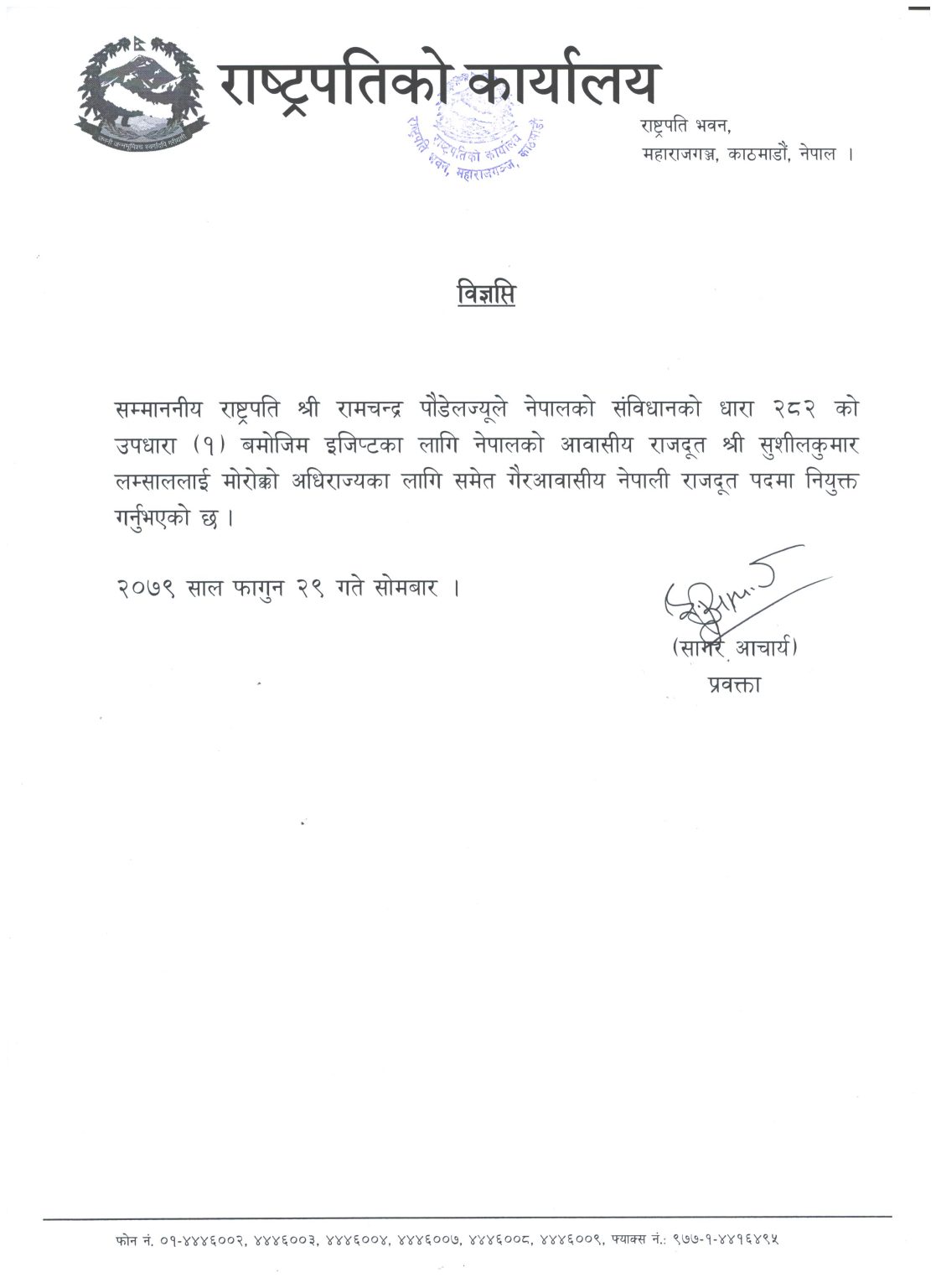 काठमाडौं । राष्ट्रपति पौडेलले फागुन २९ गते पद तथा गोपनीयताको शपथ ग्रहण गरेकै दिन सुशीलकुमार लम्साललाई मोरोक्कोका लागि गैरआवासीय नेपाली राजदूत पदमा नियुक्त गरेका हुन्। लम्साल इजिप्टका लागि आवासीय राजदूत छन्।