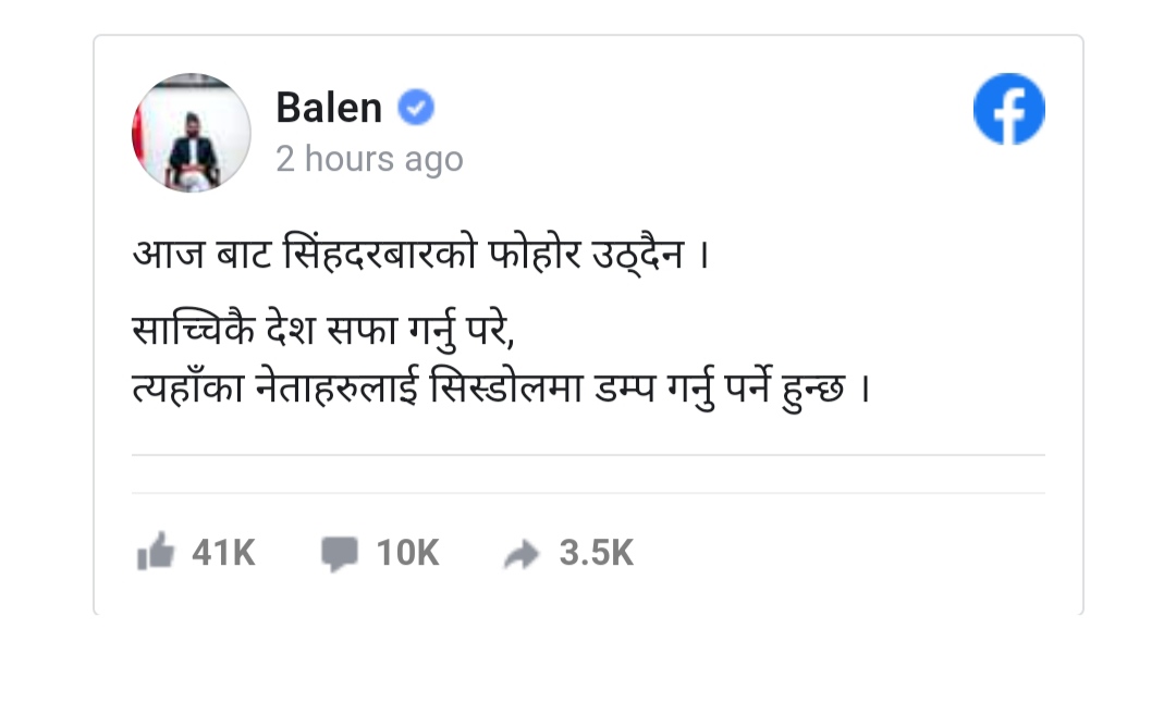 ’उनले लेखेका छन्, ‘आजबाट सिंहदरवारको फोहोर उठ्दैन । साँच्चिकै देश सफा गर्नुपरे, त्यहाँका नेताहरूलाई सिस्डोलमा डम्प गर्नुपर्ने हुन्छ ।’