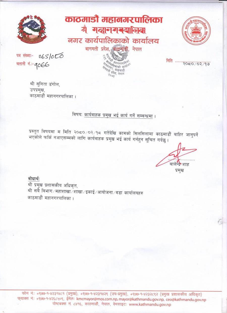 काठमाडौं । काठमाडौं महानगरका मेयर बालेन्द्र शाह (बालेन)ले आफू काठमाडौं बाहिर जानुपर्ने भएको भन्दै उपमेयर सुनिता डंगोललाई कार्यवाहक प्रमुखको जिम्मा दिएका छन् ।