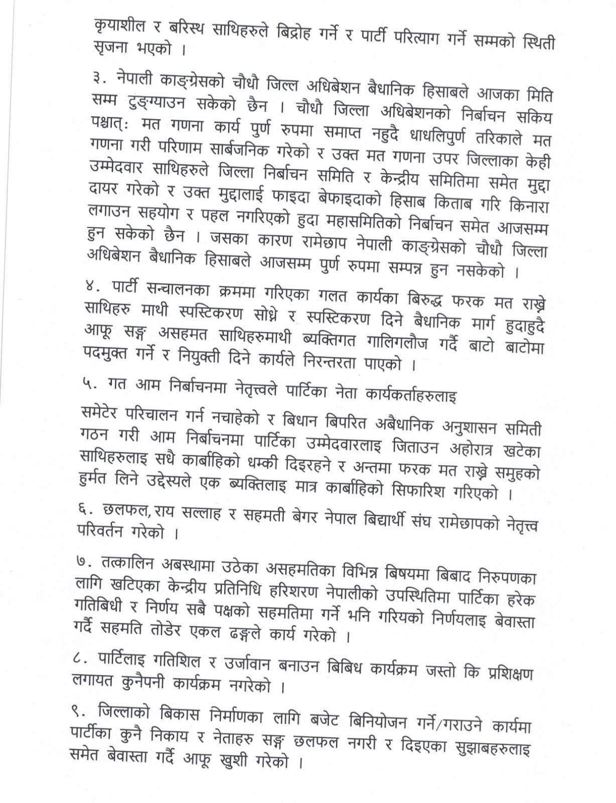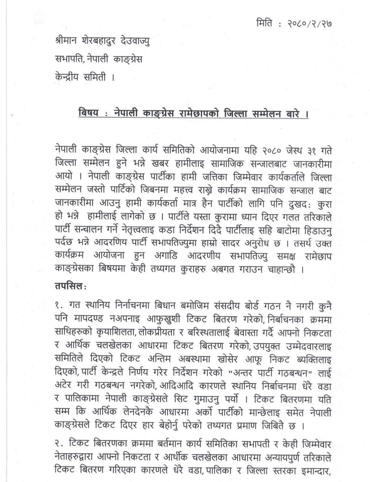 जेठ ३१ गते जिल्ला सम्मेलन हुने भनेर सामाजिक सञ्जालमा आएको भन्दै उनीहरूले जिल्ला सभापति कान्छारामले गरेका पार्टी हितविपरीतका गतिविधिहरूबारे केन्द्रलाई लिखित जानकारी गराएका हुन् ।
