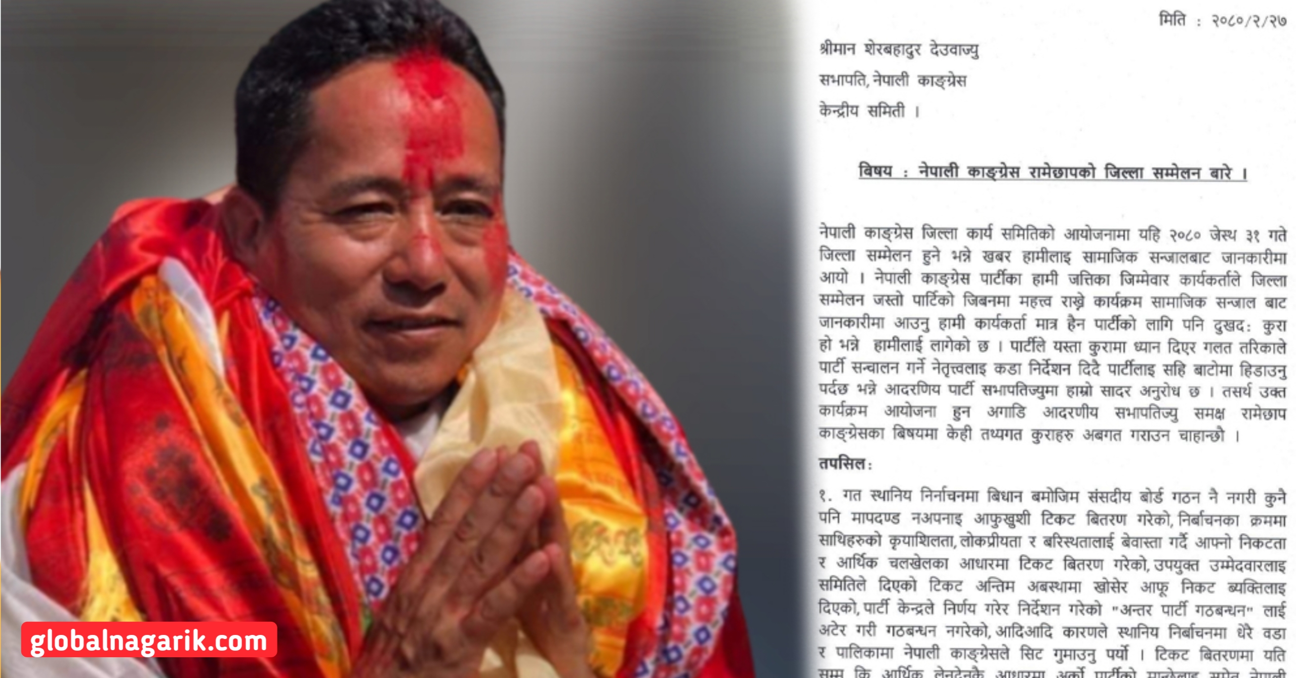 काठमाडौं । नेपाली कांग्रेसको रामेछाप जिल्ला सम्मेलनअघि प्रतिनिधि सभा सदस्य तथा जिल्ला सभापति कान्छाराम तामाङलाई विधि बमोजिम चल्न आवश्यक निर्देशन माग्दै करिब ४ दर्जन नेताले केन्द्रीय सभापति शेरबहादुर देउवालाई ११ बुँदे ध्यानाकर्षण बुझाएका छन् ।