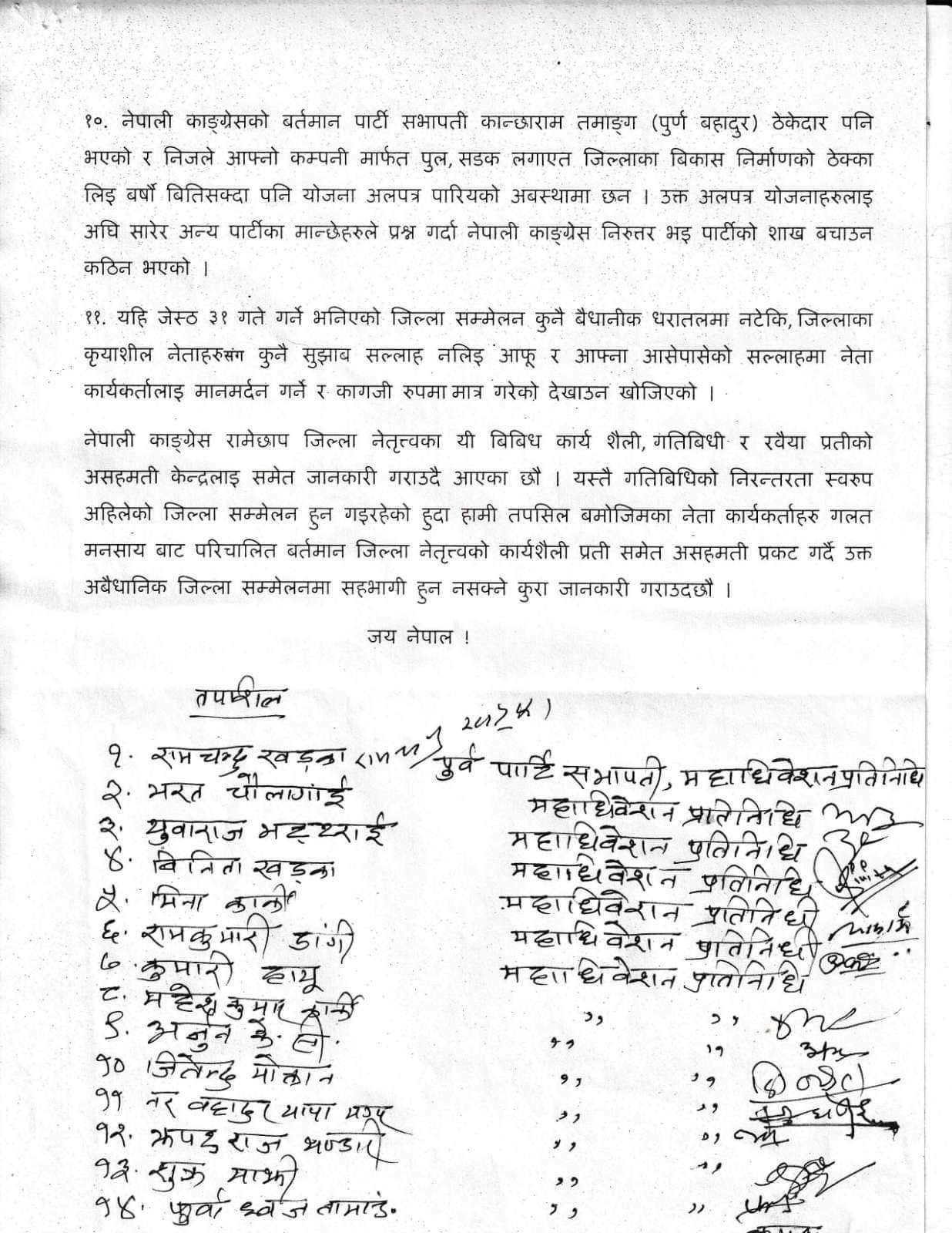 पूर्व जिल्ला सभापति तथा महाधिवेशन प्रतिनिधि रामचन्द्र खड्कासहित केन्द्रीय महाधिवेशन प्रतिनिधिहरू भरत चौलागाई,युवराज भट्टराई, बिनिता खड्का, मीना कार्की,रामकुमारी डाँगी,कुमारी हायुलगायत ४६ जनाले हस्ताक्षर गरेका छन् ।