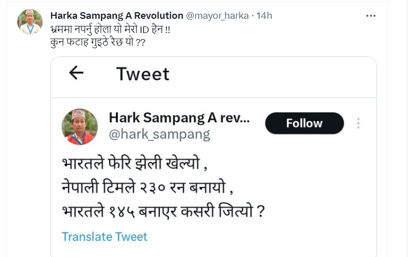 काठमाडौं । धरान उपमहानगरपालिकाका मेयर हर्क साम्पाङको नामको ट्विटर ह्यान्डलमा क्रिकेटसम्बन्धी गरिएको एउटा पोस्ट निकै ‘ट्रोल’ बनिरहेको छ।