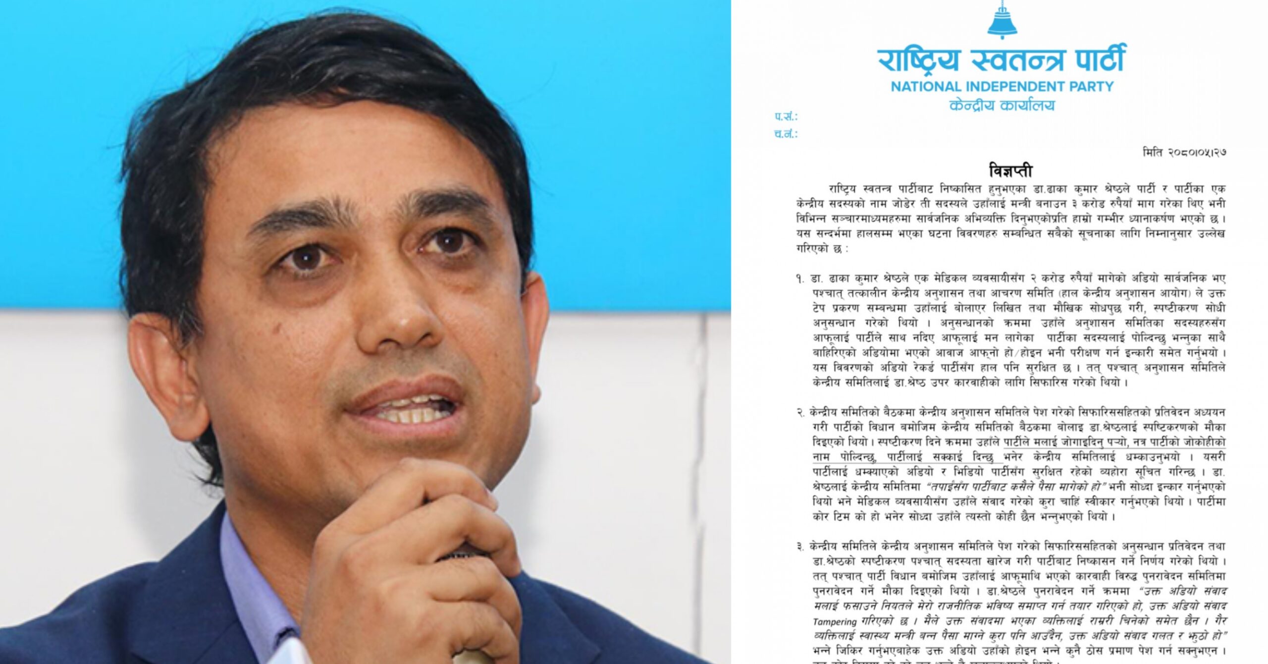 काठमाडौं । राष्ट्रिय स्वतन्त्र पार्टीबाट निष्कासित डा. ढाकाकुमार श्रेष्ठले पार्टी र पार्टीका एक केन्द्रीय सदस्यको नाम जोडेर दिएको अभिव्यक्तिप्रति आपत्ति जनाएको छ।