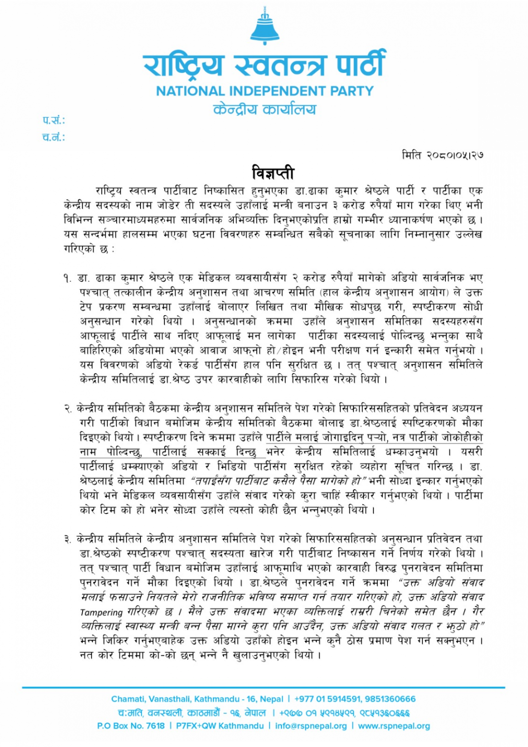 राष्ट्रिय स्वतन्त्र पार्टी पारदर्शिता, जवाफदेहिता र भ्रष्टाचारप्रति शून्य सहनशीलताको नीति अनुसरण गर्ने पार्टी भएकाले यस प्रकरणमा अझै पनि पार्टीका कुनै पनि तहको पदाधिकारी वा केन्द्रीय सदस्यले पार्टीको नाम प्रयोग गरी कसैसँग पैसा मागेको ठोस प्रमाण लिएर डा. श्रेष्ठ वा जोकोही आएको अवस्थामा पार्टीले त्यस्ता सदस्य जोकोही भए पनि प्रमाण पेश भएको ७२ घण्टाभित्र कारबाही गरिने समेत उल्लेख गरेका छन् ।