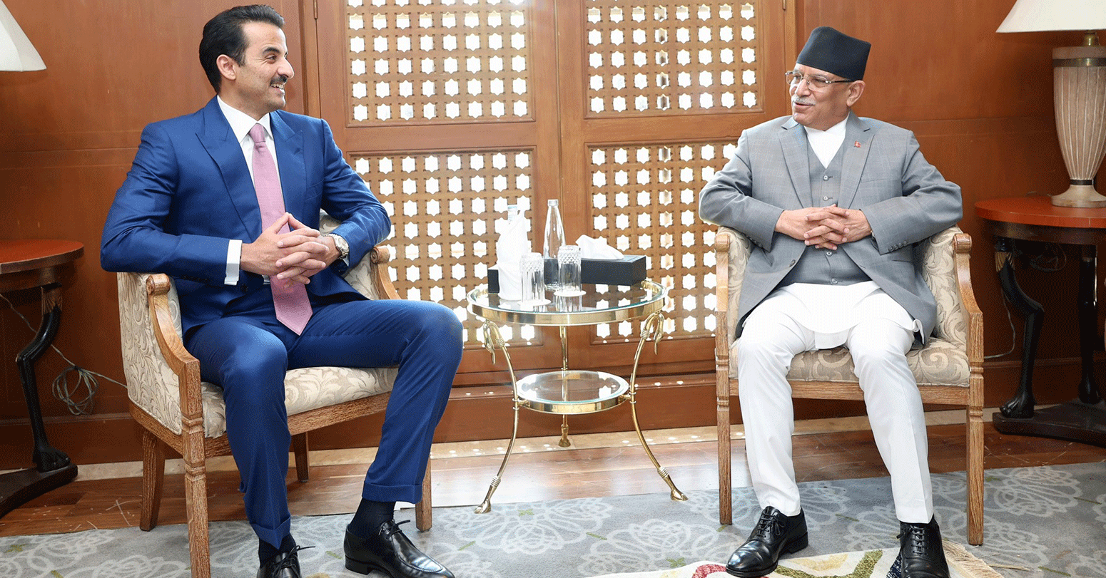 काठमाडौं । नेपालको दुईदिने राजकीय भ्रमणमा आएका कतारका राजा शेख तमिम बिन हमाद अल थानी र प्रधानमन्त्री पुष्पकमल दाहाल प्रचण्डबीच आज भेटवार्ता भएको छ । प्रधानमन्त्री प्रचण्ड र कतारी राजा थानीबीच बुधबार बिहान होटेल सोल्टीमा औपचारिक भेटवार्ता जारी छ ।