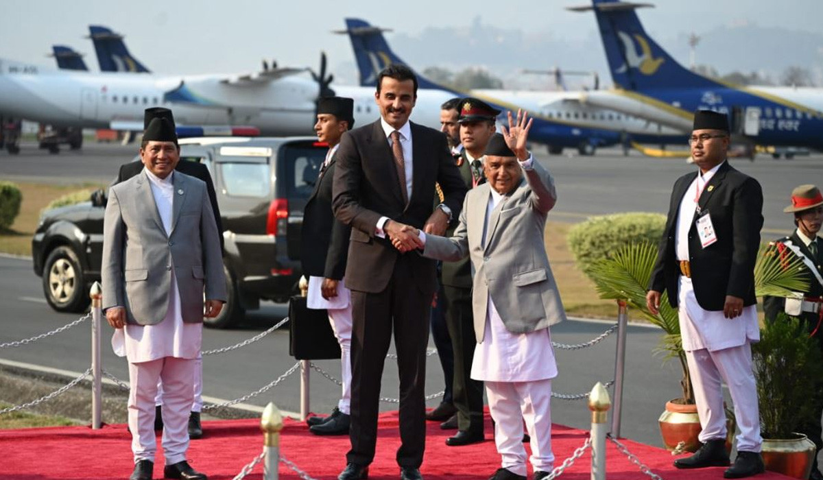 काठमाडौँ । मित्रराष्ट्र कतारका अमिर शेख तमिम विन हमाद अल थानी नेपालको दुई दिने राजकीय भ्रमण सकाएर आज स्वदेश फर्किएका छन् । उनलाई बिदाइ गर्न राष्ट्रपति रामचन्द्र पौडेल त्रिभुवन अन्तर्राष्ट्रिय विमानस्थल पुगेका थिए ।