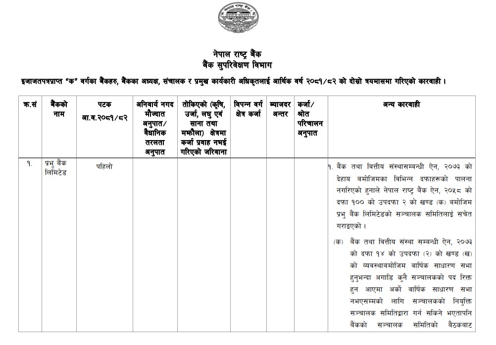 राष्ट्र बैंकले बैंक तथा वित्तीय संस्थासम्बन्धी ऐन, २०७३ को देहाय बमोजिमका विभिन्न दफाहरूको पालना नगरेकाले नेपाल राष्ट्र बैंक ऐन, २०५८ को दफा १०० को उपदफा २ को खण्ड (क) बमोजिम प्रभु बैंक लिमिटेडको सञ्चालक समिति र नेपाल राष्ट्र बैंक ऐन, २०५८ को दफा १०० को उपदफा २ को खण्ड (क) बमोजिम प्रभु बैंक लिमिटेडका प्रमुख कार्यकारी अधिकृत अशोक शेरचनलाई कार्वाही गरेको राष्ट्र बैंकले जनाएको छ।