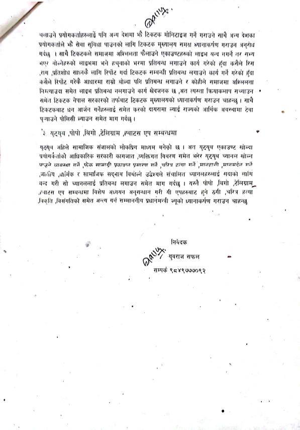 काठमाडौं । सामाजिक अभियन्ता युवराज सफलले सामाजिक सञ्जालको नियमन र नियन्त्रण कडा गर्न सरकारलाई आग्रह गर्दै प्रधानमन्त्री केपी शर्मा ओलीलाई पत्र पठाएका छन्।