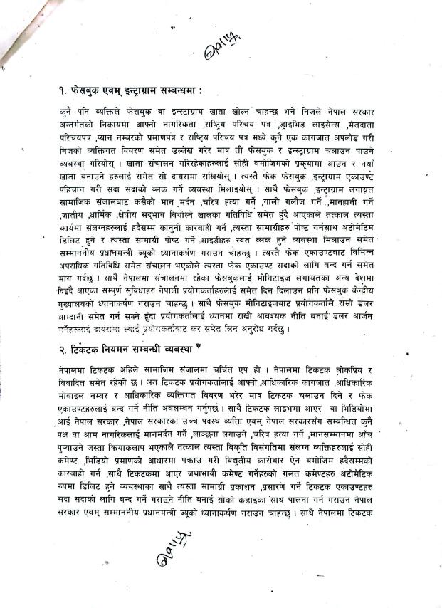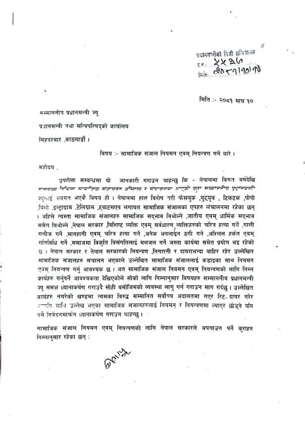 पत्रमा उनले सामाजिक सञ्जालमार्फत समाजमा सद्भाव विथोल्ने, अश्लीलता फैलाउने र आपराधिक गतिविधि प्रोत्साहन हुने कार्य रोक्न ठोस कदम चाल्न सरकारलाई अपिल गरेका छन्।
