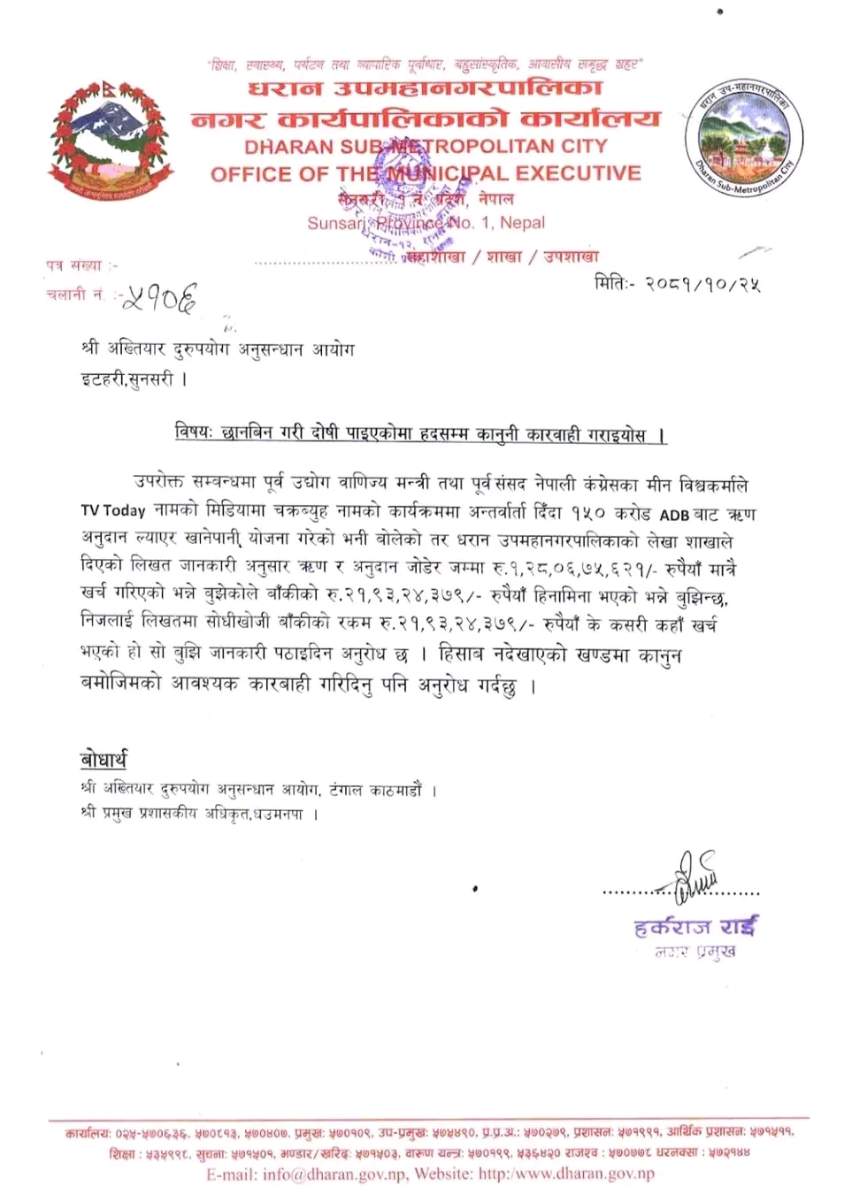 काठमाडौं – धरान उपमहानगरपालिकाका प्रमुख हर्कराज राई (हर्क साम्पाङ) ले नेपाली कांग्रेसका नेता तथा पूर्वमन्त्री मीन विश्वकर्मासँग २१ करोड ९३ लाख २४ हजार ३७९ रुपैयाँको स्पष्ट हिसाब माग गर्दै अख्तियार दुरुपयोग अनुसन्धान आयोगलाई पत्राचार गरेका छन्।
