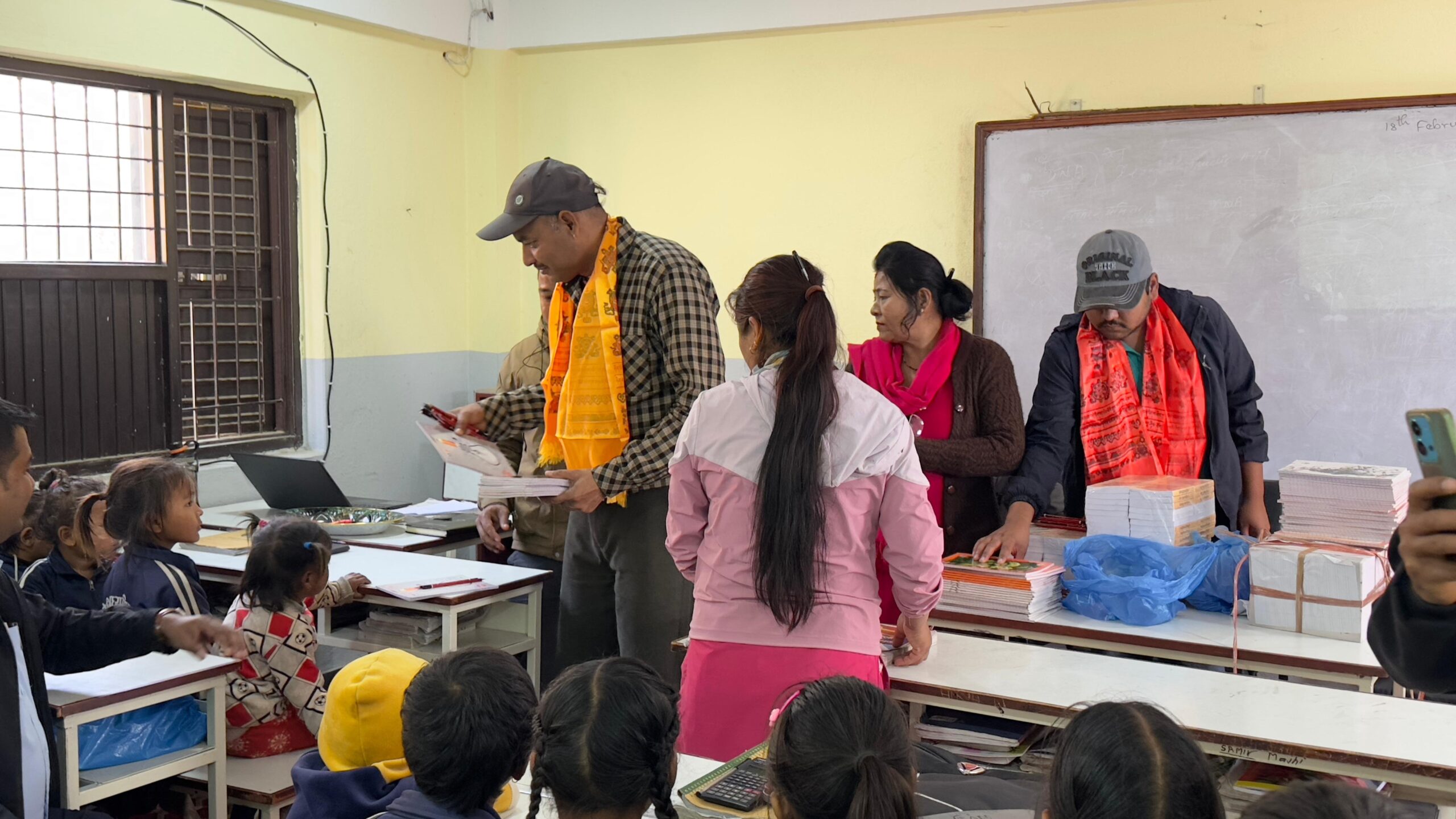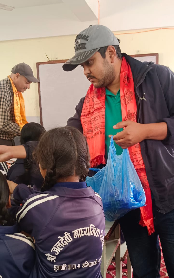 काठमाडौं । गीतकार एवं मुक्तककार प्रमोद भण्डारी र अध्येता एवं लेखक अभिषेक जोशीको नेतृत्वमा आज रामेछापको सुनापती गाउँपालिका-५ खनियापानीको जलदेवी मा.वि मा कक्षा १ देखि ५ सम्मको प्रत्येक विद्यार्थीलाई कापी र सिसाकलम वितरण गरिएको छ। साथै कक्षा ६ देखि १० सम्मको प्रत्येक विद्यार्थीलाई कापी, डटपेन र श्रीमद्भागवतगीता पुस्तक वितरण गरिएको छ।