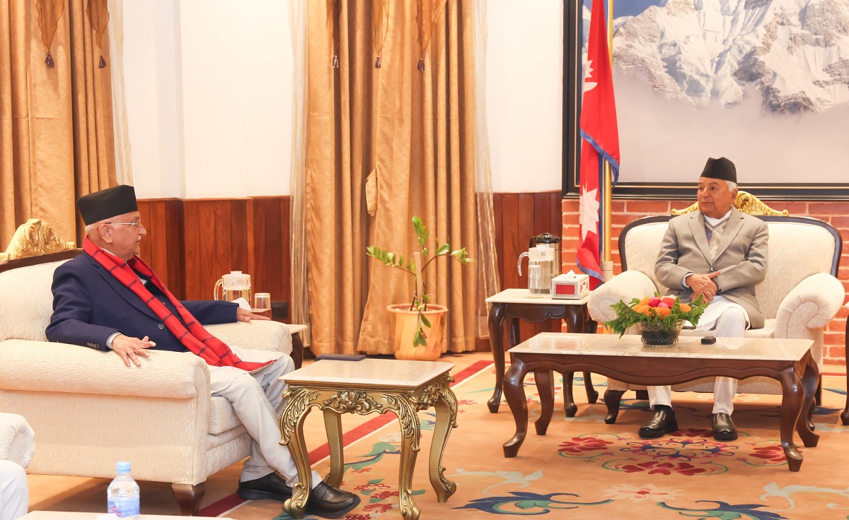 शनिबार साँझ शीतलनिवास पुगेर प्रधानमन्त्री ओलीले राष्ट्रपति पौडेलसँग भेटवार्ता गरेका हुन्।