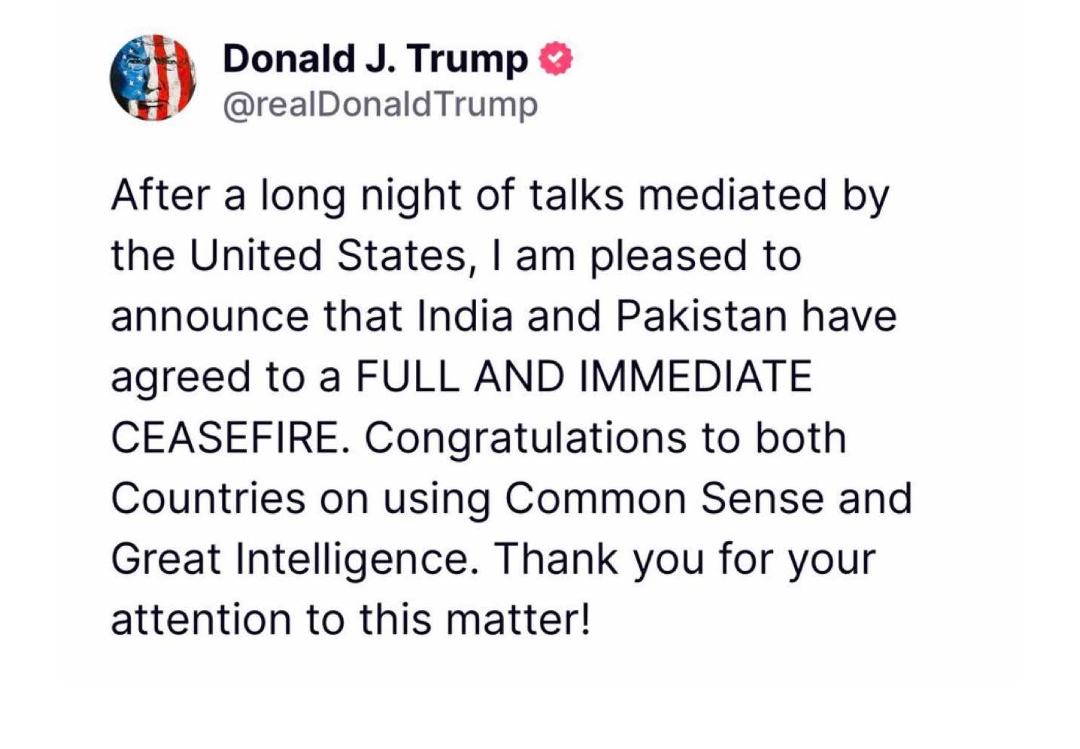 ट्रम्को दाबी अनुसार, अमेरिकाको मध्यस्थतामा भएको लामो वार्तापछि युद्धविरामका लागि दुवै देश सहमत भएका हुन् ।