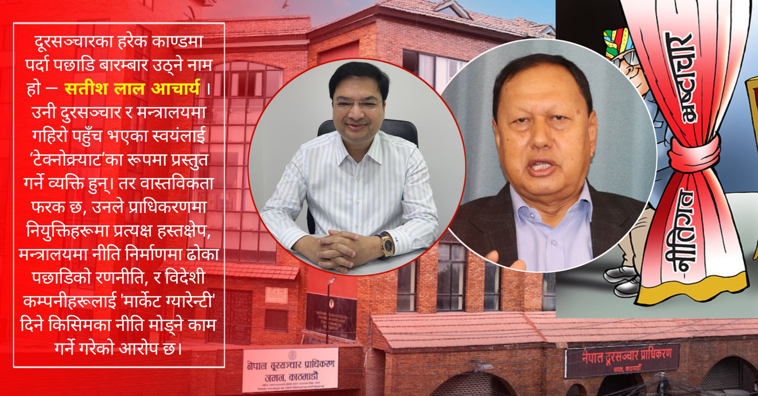 दूरसञ्चारका हरेक काण्डमा पर्दा पछाडि बारम्बार उठ्ने नाम हो — सतीश लाल आचार्य । उनी दुरसञ्चार र मन्त्रालयमा गहिरो पहुँच भएका स्वयंलाई ‘टेक्नोक्र्याट’का रूपमा प्रस्तुत गर्ने व्यक्ति हुन्। तर वास्तविकता फरक छ, उनले प्राधिकरणमा नियुक्तिहरूमा प्रत्यक्ष हस्तक्षेप, मन्त्रालयका नीति निर्माणमा ढोका पछाडिको रणनीति, र विदेशी कम्पनीहरूलाई ‘मार्केट ग्यारेन्टी’ दिने किसिमका नीति मोड्ने काम गरेका छन्।