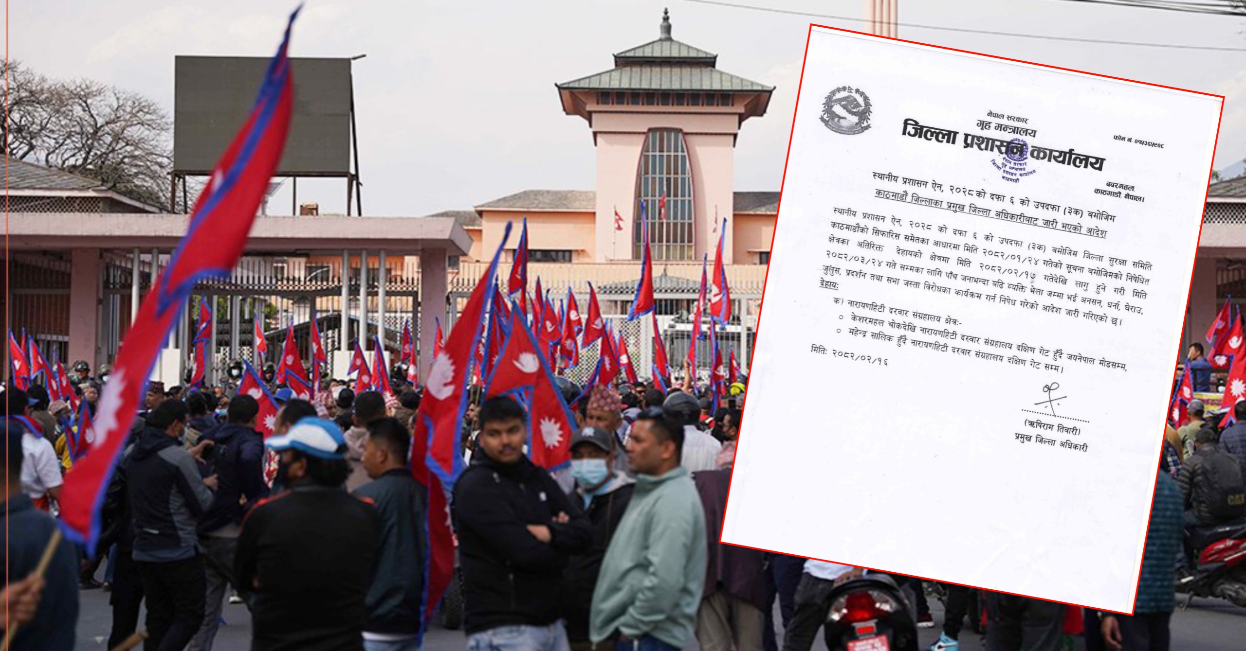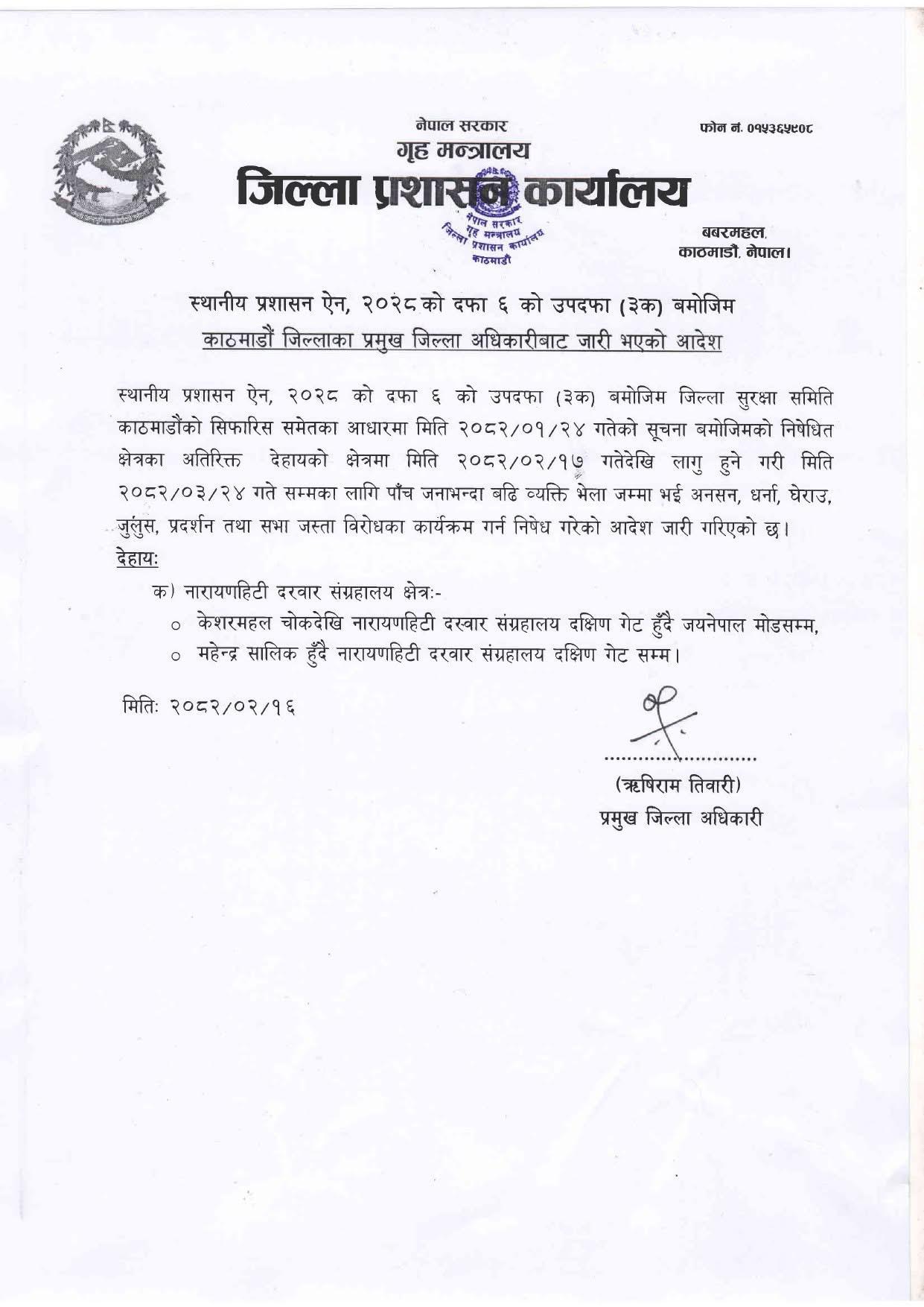 काठमाडौँका प्रमुख जिल्ला अधिकारी ऋषिराम तिवारीले शुक्रबार आदेश जारी गर्दै सो क्षेत्रभित्र पाँच जनाभन्दा बढी भेला भई अनशन, धर्ना, प्रदर्शन, जुलुस, सभा वा अन्य कुनै प्रकारका विरोध कार्यक्रम गर्न नपाइने व्यवस्था गरिएको जानकारी दिएका हुन्।