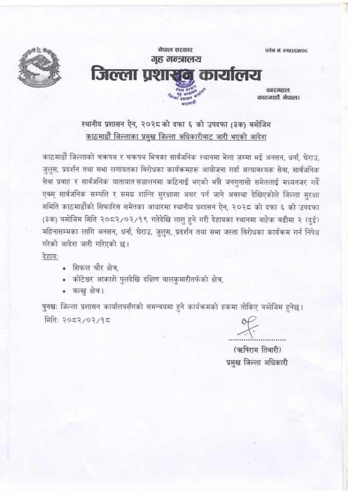 जिल्ला प्रशासन कार्यालय काठमाडौंका प्रमुख जिल्ला अधिकारी ऋषिराम तिवारीका अनुसार, यी स्थानहरूमा लागू गरिएको निषेधाज्ञा अधिकतम दुई महिनासम्म कायम रहनेछ। प्रशासनले जनसुरक्षा र शान्ति सुरक्षाको दृष्टिकोणले यस्तो कदम चालिएको बताएको छ।