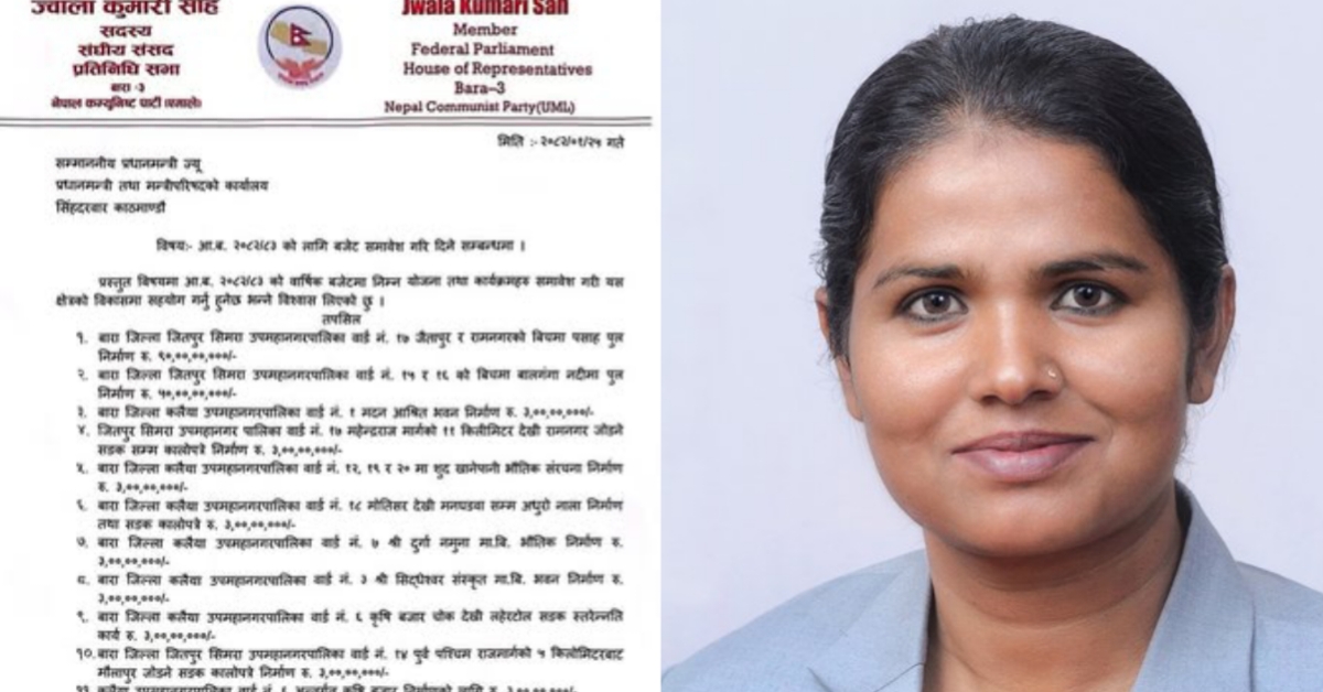 काठमाडौँ । सरकारले नेकपा एमालेकी सांसद ज्वालाकुमारी साहको निर्वाचन क्षेत्रमा ‘मदन आश्रित’को नाममा भवन निर्माण गर्न ३ करोड रुपैयाँ बजेट विनियोजन गरेको छ। आगामी आर्थिक वर्ष २०८२/८३ को बजेटमार्फत सहरी विकास मन्त्रालय अन्तर्गत यो रकम छुट्याइएको हो।