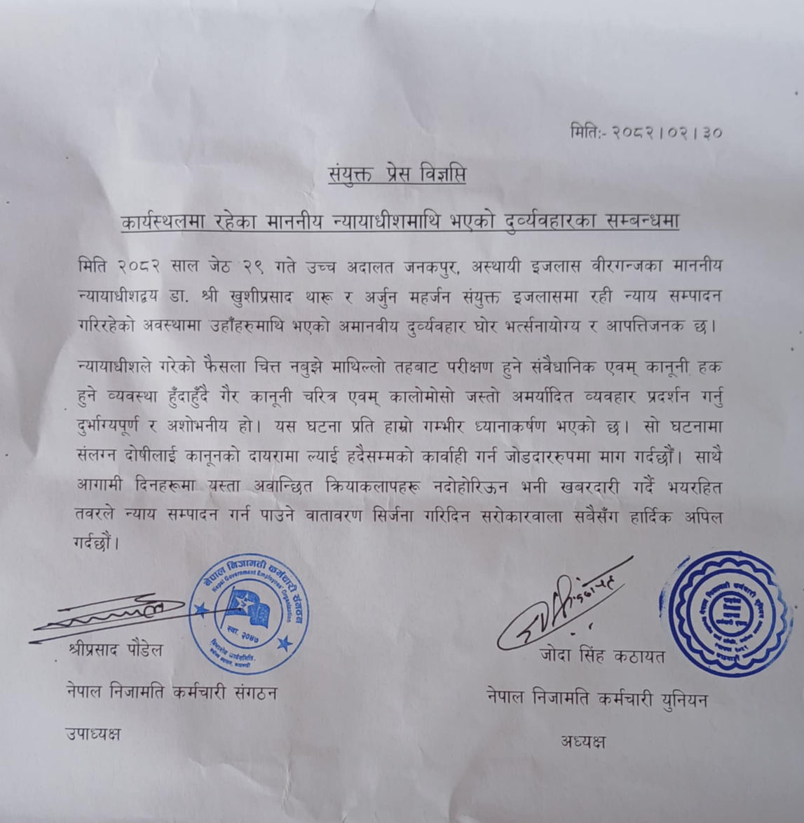 काठमाडौं । उच्च अदालत वीरगञ्जका न्यायाधीशमाथि भएको दुर्व्यवहारलाई लिएर निजामती कर्मचारी सम्वद्ध ट्रेड युनियनहरूले आपत्ति जनाएका छन् ।