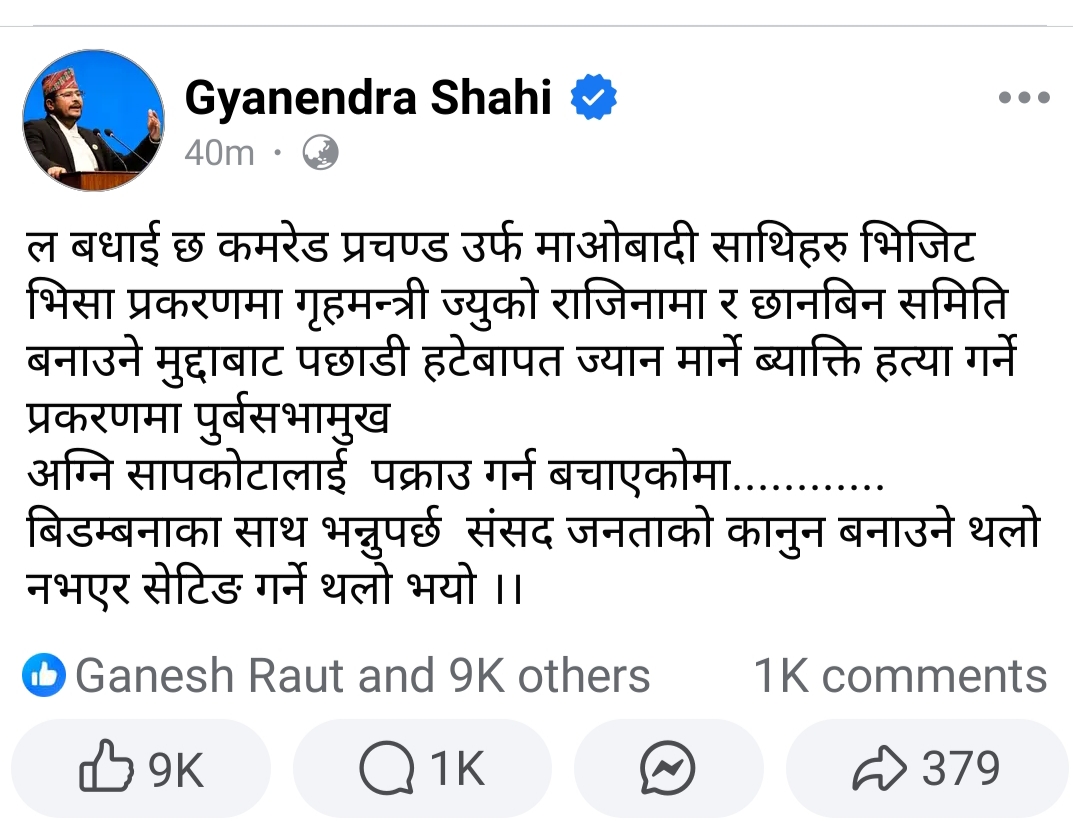 शाहीले सामाजिक सञ्जाल फेसबुकमार्फत भनेका छन्, “बधाई छ कमरेड प्रचण्ड उर्फ माओवादी मित्रहरू, गृहमन्त्रीको राजीनामा र छानबिन समिति गठनको मुद्दाबाट पछि हटेर पूर्वसभामुख अग्नि सापकोटालाई हत्या अभियोगमा पक्राउ हुनबाट जोगाउन सफल भएकोमा!”