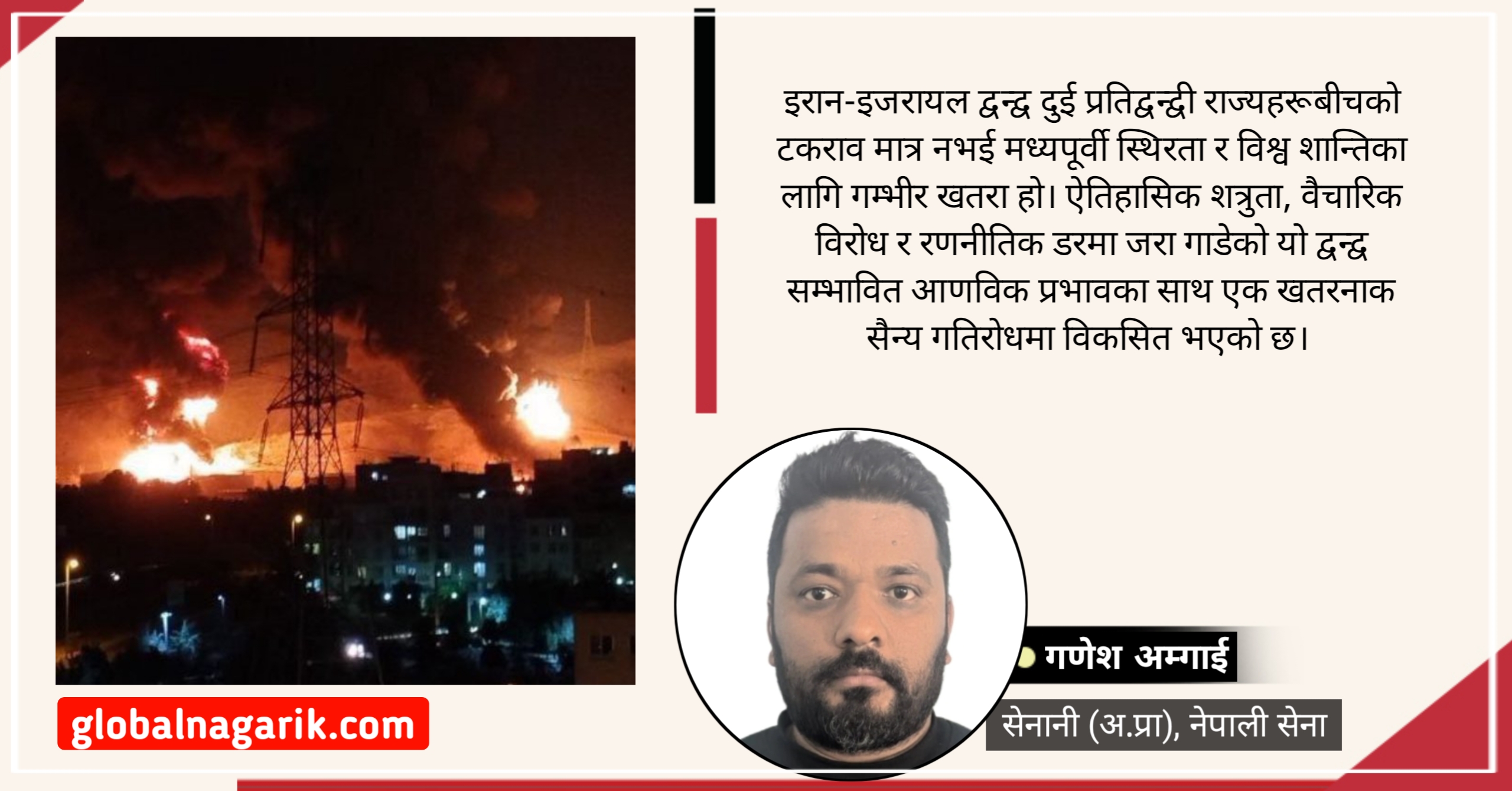 इरान-इजरायल द्वन्द्व दुई प्रतिद्वन्द्वी राज्यहरूबीचको टकराव मात्र नभई मध्यपूर्वी स्थिरता र विश्व शान्तिका लागि गम्भीर खतरा हो।