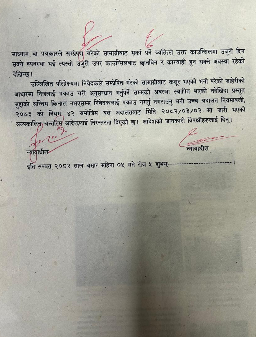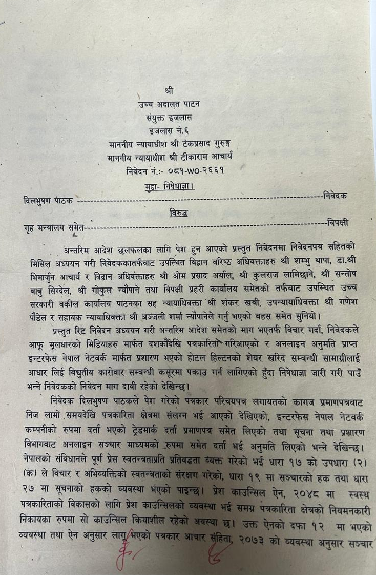 काठमाडौं । पत्रकार दिलभूषण पाठकलाई पक्राउ नगर्न उच्च अदालत पाटनले बिहीबार अन्तरिम आदेश दिएको छ। न्यायाधीशद्वय टंकप्रसाद गुरुङ र टीकाराम आचार्यको इजलासले उक्त आदेश जारी गरेको हो।