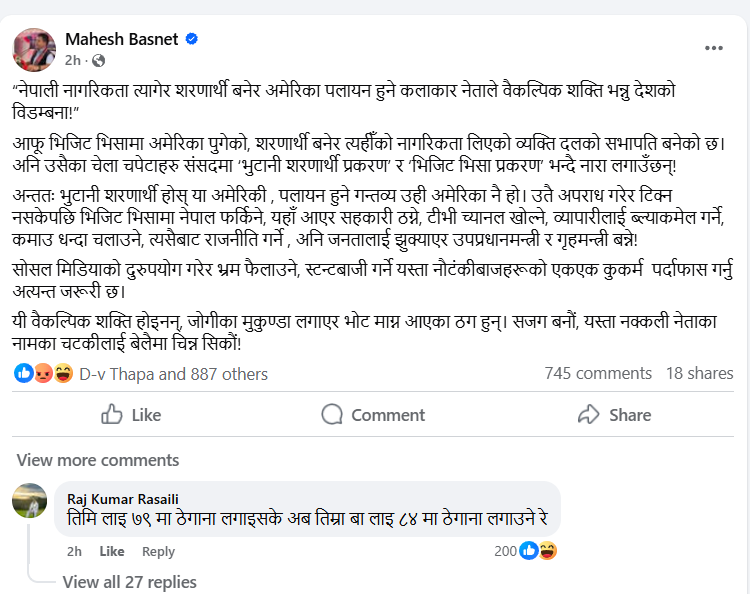 “नेपाली नागरिकता त्यागेर शरणार्थी बनेर अमेरिका पलायन हुने कलाकार नेताले वैकल्पिक शक्ति भन्नु देशको विडम्बना!” उनले लेखेका छन्।