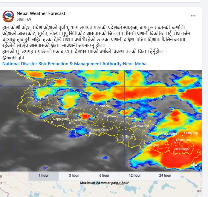 महाशाखाका अनुसार कोशी प्रदेश, मधेश प्रदेशको पूर्वी भू-भाग, गण्डकी प्रदेशको स्याङ्जा, बागलुङ र कास्की, साथै कर्णाली प्रदेशको जाजरकोट, सुर्खेत, डोल्पा र मुगु (सिमिकोट आसपास) मा हाल मौसमी प्रणाली सक्रिय रहेको छ। ती क्षेत्रमा मेघगर्जन, चट्याङ, हावाहुरीसहित हल्कादेखि मध्यम वर्षा भइरहेको छ।
