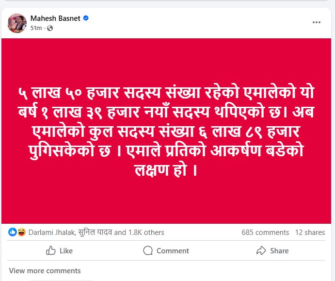 बस्नेतले सामाजिक सञ्जालमार्फत जानकारी दिँदै भनेका छन्, “५ लाख ५० हजार पुराना सदस्यमा नयाँ १ लाख ३९ हजार थपिँदा यो संख्या पुगेको हो। एमालेप्रतिको जनआकर्षण बढ्दो क्रममा रहेको यसको प्रमाण हो।”