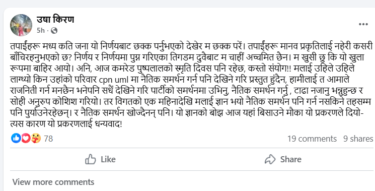 तर पछिल्लो एक महिनायता उनले त्यस्तो नैतिक समर्थन दिन नसकिने अवस्था आएको भन्दै असन्तुष्टि प्रकट गरेकी छन्। उनले लेखेकी छन्, “नैतिक समर्थन पनि गर्न नसकिने तहसम्म पनि पुर्याउने रहेछन्, र नैतिक समर्थन खोज्दैनन् पनि।”