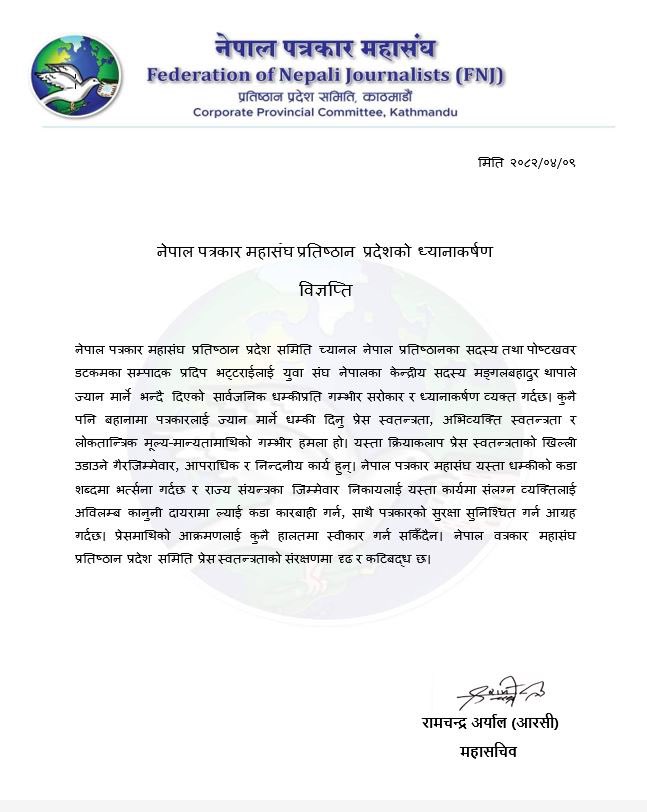 महासंघले पत्रकारलाई ज्यान मार्ने धम्की दिने कार्यप्रति भर्त्सना गर्दै राज्य संयन्त्र र जिम्मेवार निकायलाई यस्ता कार्यमा संलग्न व्यक्तिलाई अविलम्ब कानुनी दायरामा ल्याई कडा कारबाही गर्न माग गरेको छ। साथै, पत्रकारको सुरक्षामा कुनै किसिमको सम्झौता नहुने स्पष्ट पार्दै प्रेस तथा पत्रकारमाथि हुने आक्रमणलाई गम्भीर रूपमा लिन सरकारलाई आग्रह गरेको छ।