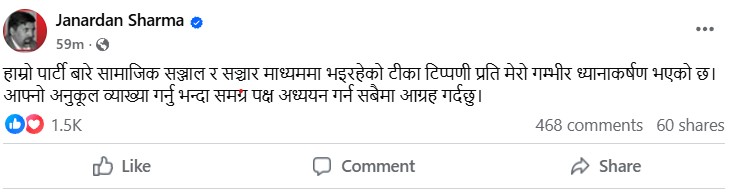 सोमबार फेसबुकमा स्टाटस लेख्दै शर्माले यस्ता टिप्पणीहरू व्यक्तिगत हितअनुसारको व्याख्या हुन नहुने स्पष्ट पारेका छन्। शर्माले लेखेका छन्, “हाम्रो पार्टीबारे सामाजिक सञ्जाल र सञ्चारमाध्यममा भइरहेका टीका–टिप्पणीले मेरो गम्भीर ध्यानाकर्षण गराएको छ।”