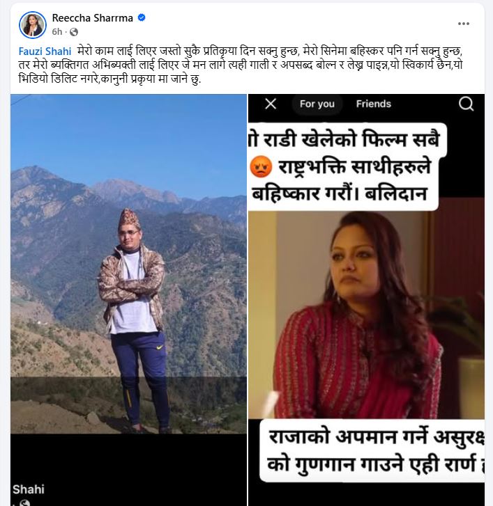 मंगलबार ऋचाले शाहीको टिप्पणी सार्वजनिक गर्दै ती अभिव्यक्तिप्रति आपत्ति जनाएकी हुन्। उनले स्पष्ट शब्दमा भनेकी छन्, “फौजी शाही मेरा कामप्रति प्रतिक्रिया दिन सक्नुहुन्छ, मेरो सिनेमा बहिष्कार गर्न पनि स्वतन्त्र हुनुहुन्छ, तर मेरो व्यक्तिगत अभिव्यक्तिलाई लिएर गालीगलौज र अपशब्द प्रयोग गर्नु स्वीकार्य छैन।”