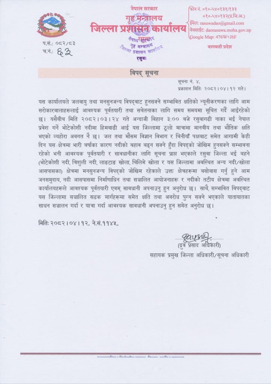 रसुवा । रसुवा जिल्लामा लगातारको वर्षा र भोटेकोसी नदीमा आएको बाढीका कारण उच्च जोखिमको सम्भावना देखिएको भन्दै जिल्ला प्रशासन कार्यालय रसुवाले सतर्कता अपनाउन सर्वसाधारणलाई आग्रह गरेको छ।