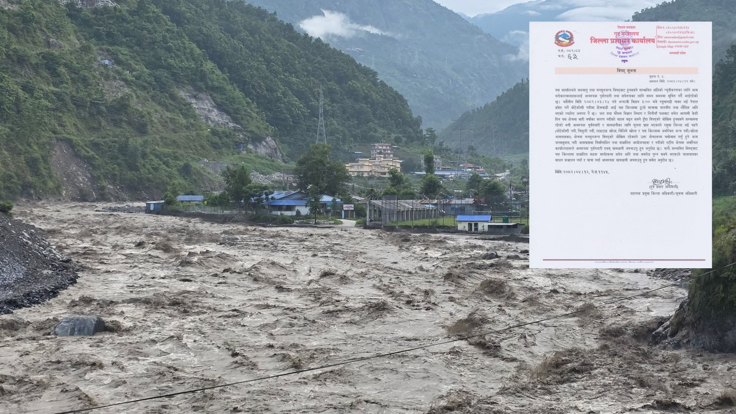 जिल्ला प्रशासनले आइतबार जारी गरेको ‘विपद् सूचना’मा असार १३ गते राति २ बजेदेखि नेपाल प्रवेश गर्ने भोटेकोसी नदीको जलप्रवाह उच्च भएर हिमालयबाट आएको बाढीका कारण जनधनको क्षति हुन सक्ने सम्भावना औंल्याइएको छ। बाढीका कारण नदी आसपासका बस्ती, पुल र सडकमा क्षति पुग्न सक्ने भएकाले सावधानी अपनाउन प्रशासनले अनुरोध गरेको हो।