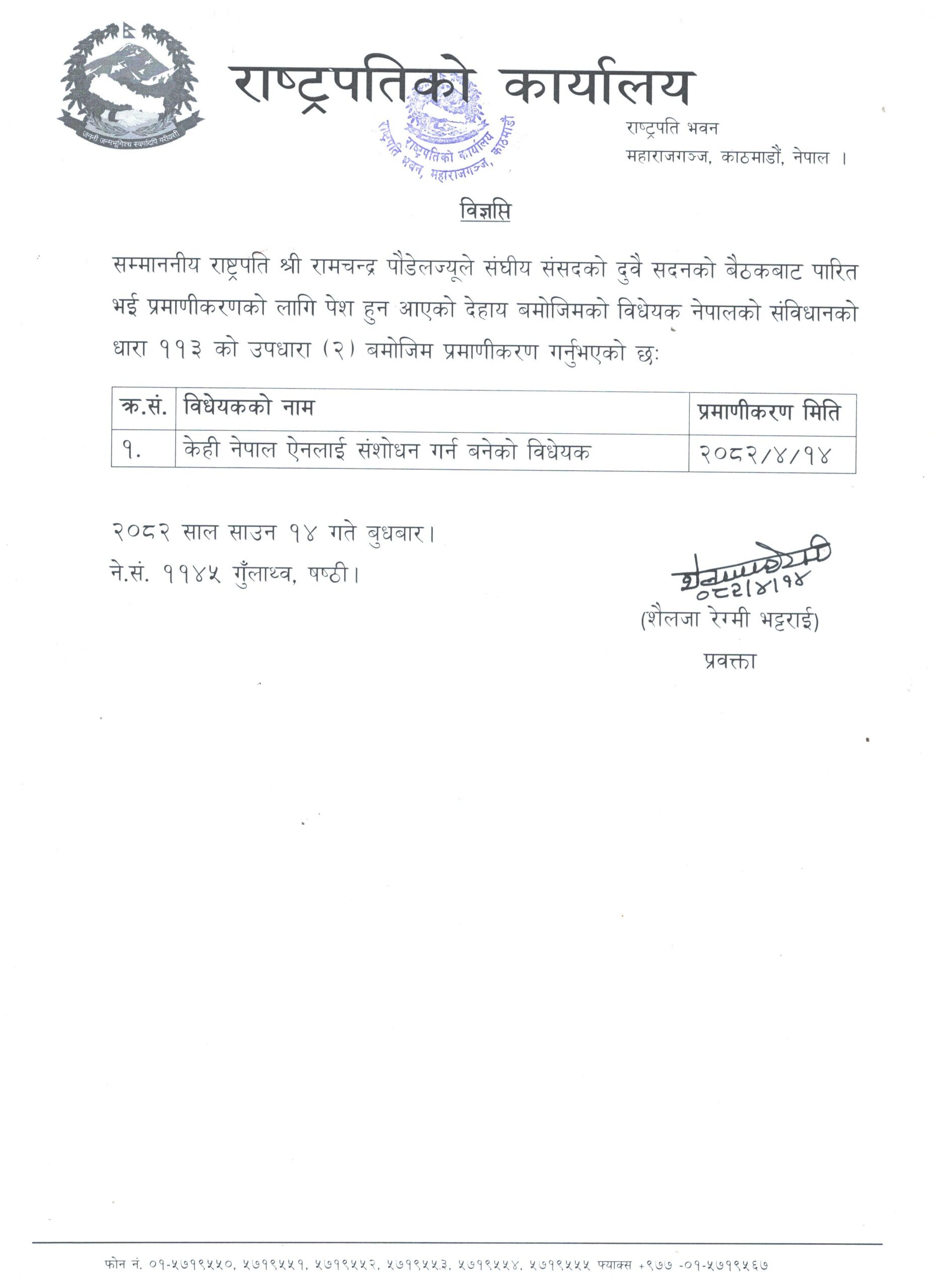 ‘राष्ट्रपति रामचन्द्र पौडेलले संघीय संसदको दुवै सदनको बैठकबाट पारित भई प्रमणीकरणको लागि पेस हुन आएको विधेयक नेपालको संविधानको धारा ११३ को उपधारा २ बमोजिम प्रमाणीकरण गर्नुभएको छ’, विज्ञप्तिमा लेखिएको छ ।