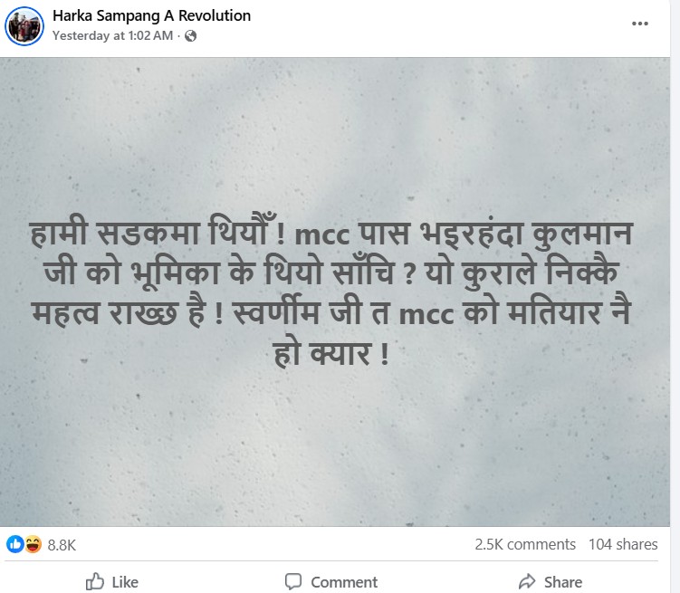 सामाजिक सञ्जालमार्फत साम्पाङले लेखेका छन्, “हामी त सडकमा थियौँ! एमसिसी पास भइरहँदा कुलमान जीको भूमिका के थियो साँच्चै?” उनले अगाडि थपे, “यो कुरा धेरै महत्वपूर्ण छ है! स्वर्णीम जी त एमसिसीको मतियार नै हो क्यार!”