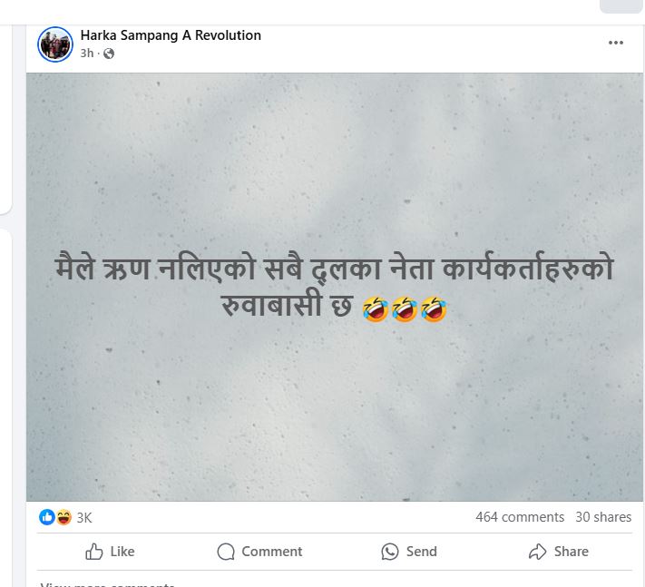 “म राजनीति गर्न आएको, ऋण लिन होइन,” भन्दै एक जना नेताले सार्वजनिक कार्यक्रममा भावुक अभिव्यक्ति दिएका थिए। अर्का एक नेताले भने, “हामीमाथि गलत आरोप लगाइएको छ, म कसैको एक रुपैयाँ पनि खान्न भनेर भनेका थिए।”