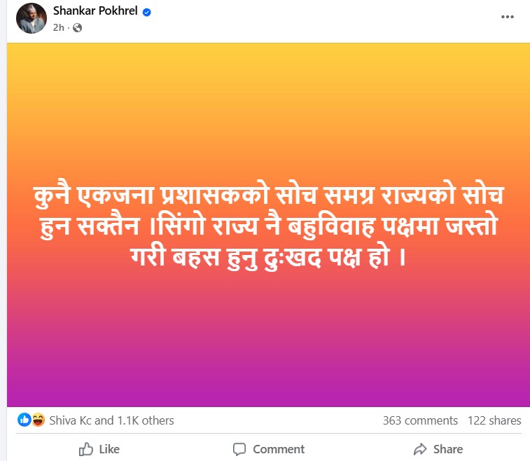 ‘कुनै एक प्रशासकको सोचलाई सम्पूर्ण राज्यको धारणा ठान्नु भ्रामक र दुर्भाग्यपूर्ण हो,’ पोखरेलले लेखेका छन्, ‘सिंगो राज्य नै बहुविवाहको समर्थनमा उभिएको जस्तो भ्रम सिर्जना गरिनु दुःखद विषय हो।’