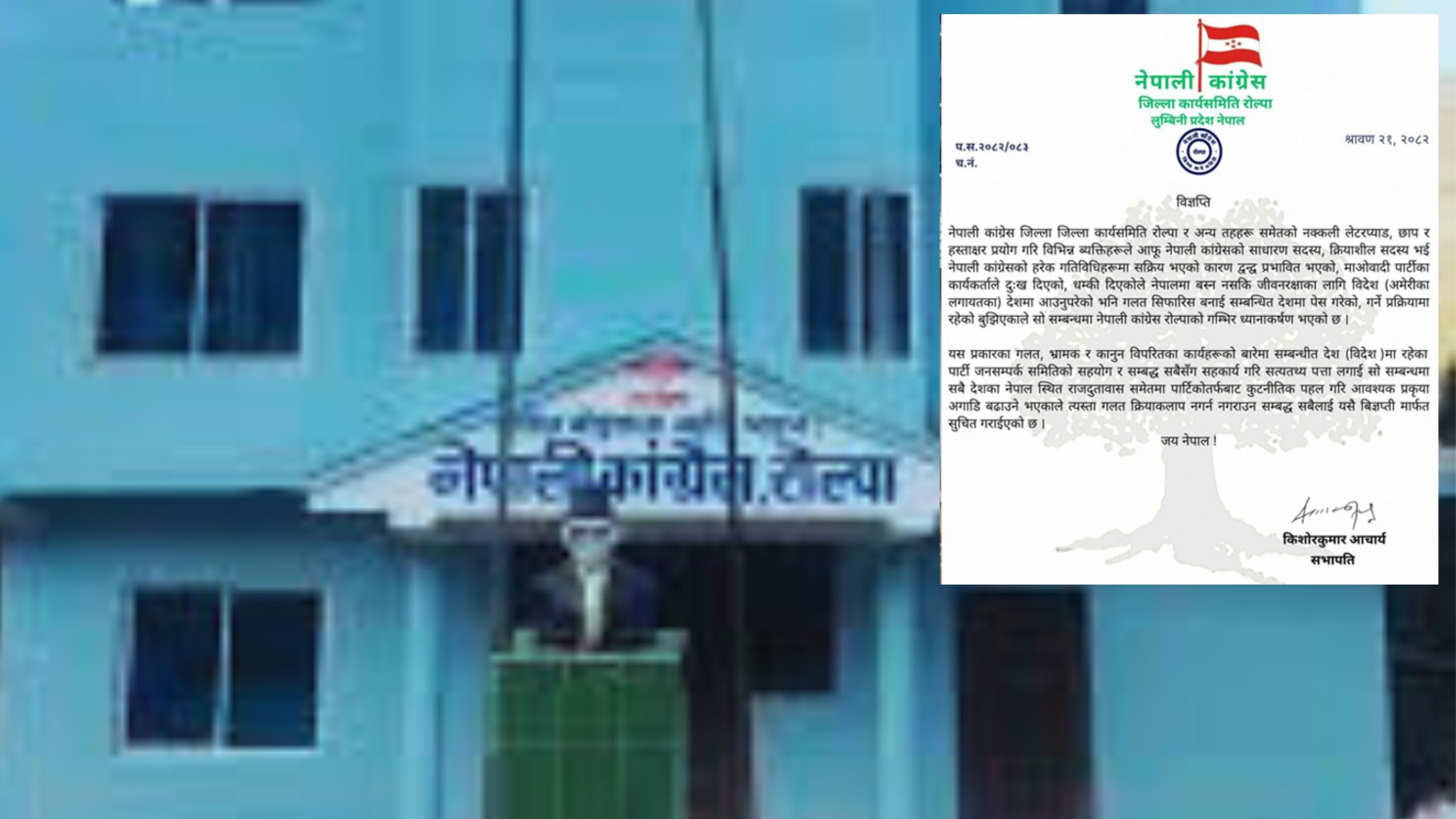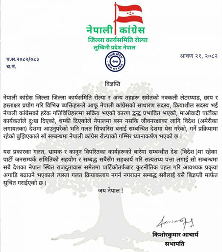 कांग्रेस रोल्पा सभापति किशोर कुमार आचार्यद्वारा बुधबार जारी विज्ञप्तिमा जिल्लास्तरीय तथा अन्य तहका नक्कली लेटरप्याड, छाप र हस्ताक्षर प्रयोग गरी द्वन्द्वकालीन पीडितको रूपमा देखाउने नक्कली कागजात तयार पारिएको उल्लेख गरिएको छ।