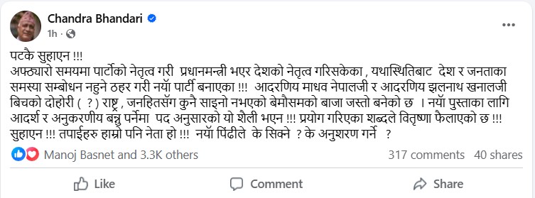 उनका अनुसार, कठिन समयको नेतृत्व गर्दै प्रधानमन्त्री भइसकेका र यथास्थितिबाट देशका समस्या समाधान नहुने ठहर गर्दै नयाँ दल गठन गरिसकेका नेताले यस्ता शैलीका विवाद सिर्जना गर्नु शोभनीय होइन।
