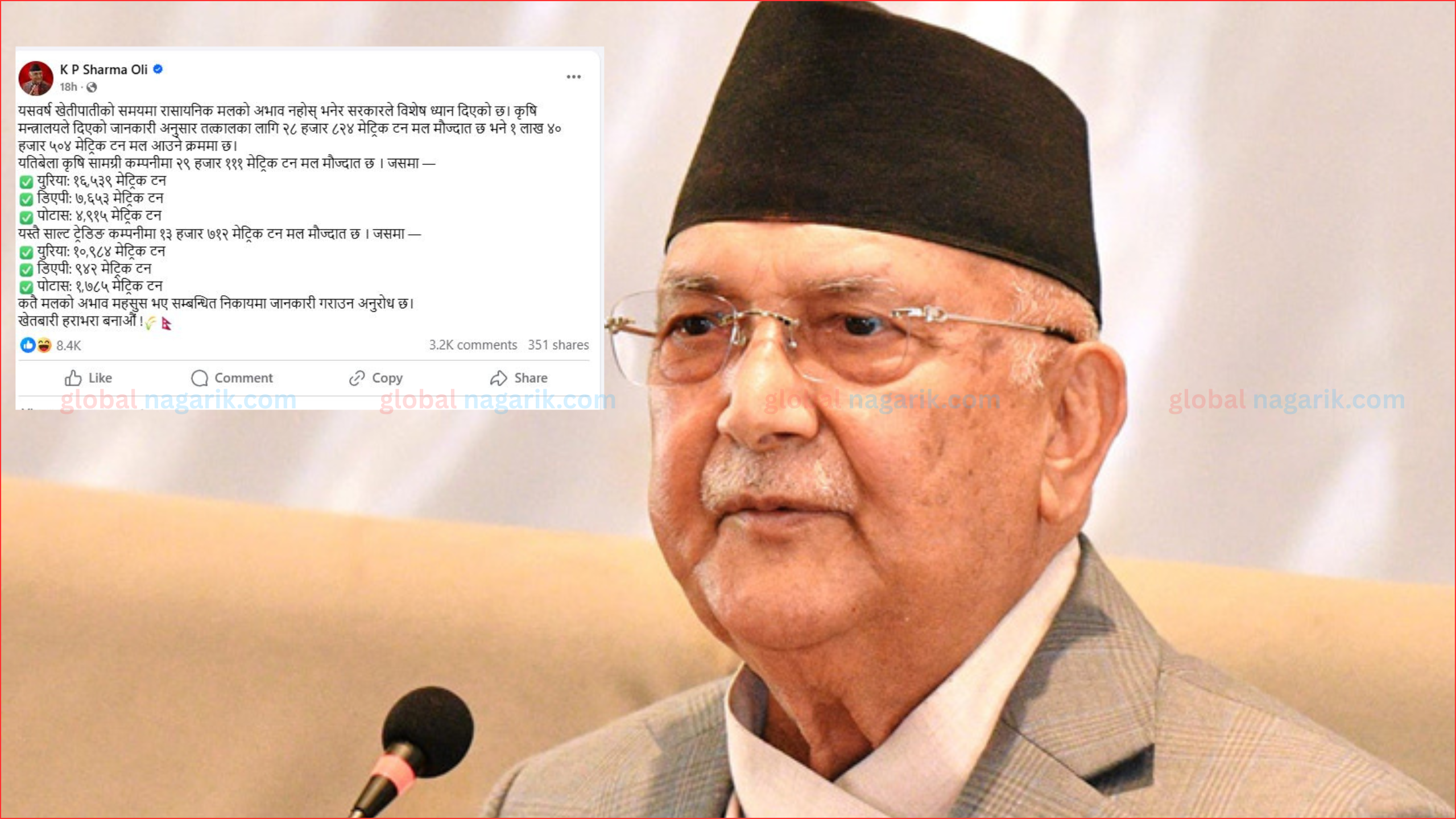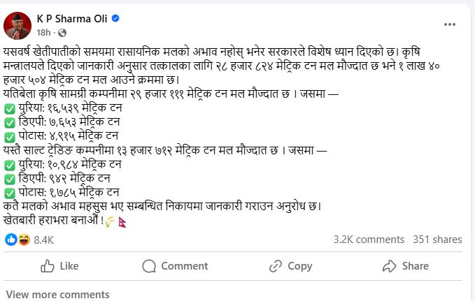 काठमाडाैं । तराईका किसानहरू अहिले मलको अभावले निकै आक्रान्त छन्। सरकारी डिपोमा मल नपाएर किसानहरू उच्च मूल्य तिर्ई किन्न बाध्य छन्। यद्यपि, प्रधानमन्त्री केपी शर्मा ओलीले सामाजिक सञ्जालमार्फत मलको अभाव नरहेको दाबी गरेका छन्। उनले हालै उपलब्ध रहेको मल र आउने मलको विस्तृत विवरण सार्वजनिक गर्दै किसानलाई मलको कमी नहुने आश्वासन दिएका थिए।