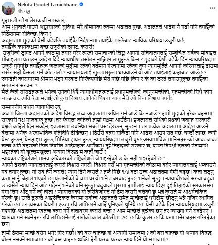 “मुद्दाको पेशी चढ्ने दिनमै न्याय परिषद्मा उजुरी पुग्छ भने, कुन न्यायाधीशले आफ्नो करियर दाउमा राखेर सही फैसला गर्ने आँट गर्ने? अदालतलाई खुलेआम धम्की दिने साहस गृहमन्त्रीलाई कहाँबाट आयो?” निकिताले प्रश्न गरेकी छन्।