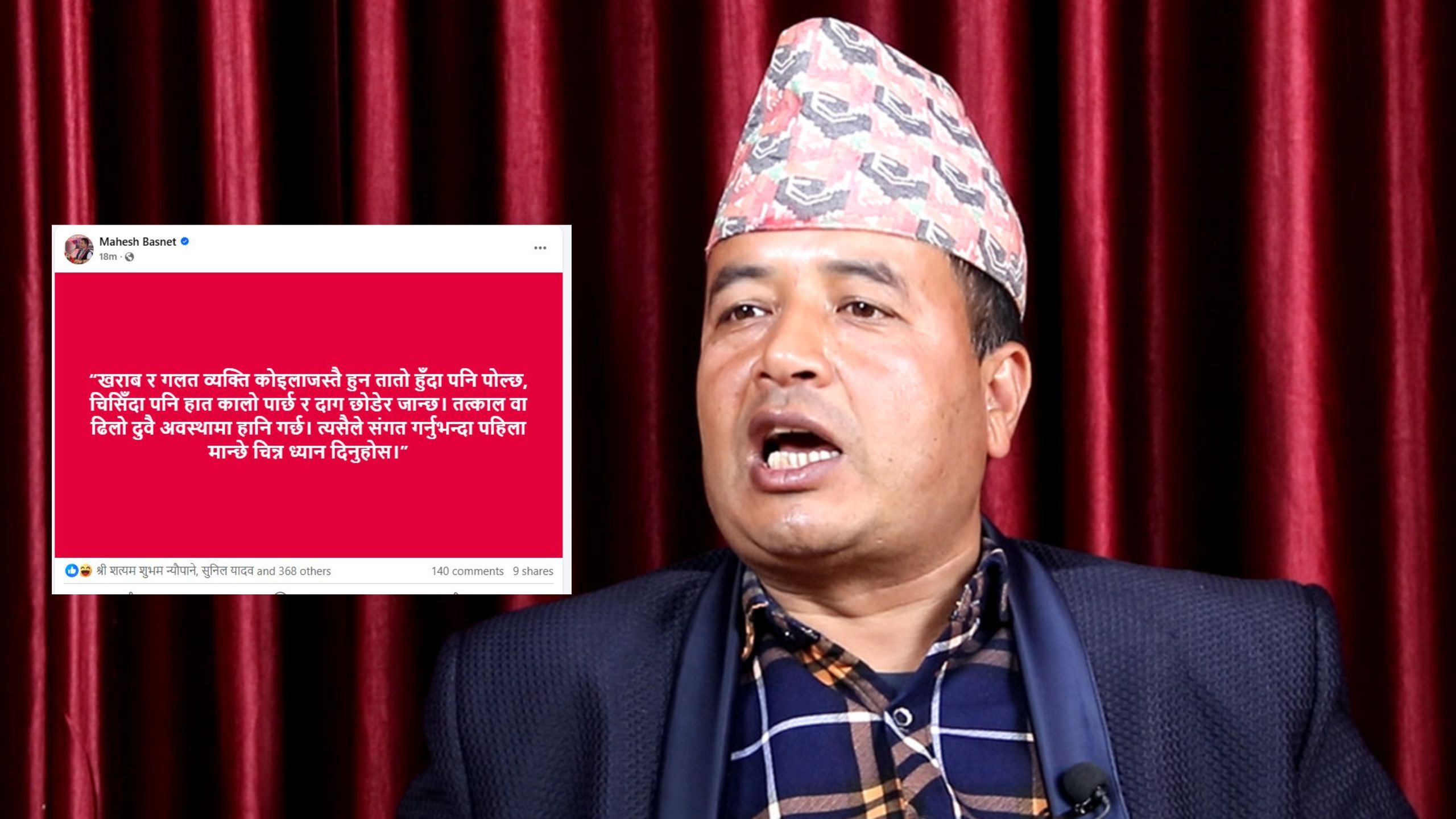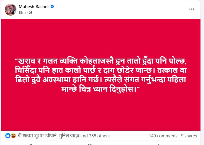 काठमाडौं । सामाजिक विचारक महेश बस्नेतले व्यक्तिको चरित्र नचिनेर संगत गर्दा दीर्घकालीन नोक्सानी हुने चेतावनी दिएका छन्। बस्नेतले आफ्नो विचार व्यक्त गर्दै भनेका छन्, “खराब र गलत व्यक्ति कोइलाजस्तै हुन्छन्। तातो हुँदा पनि पोल्छ, चिसो हुँदा पनि हात कालो पार्छ र दाग छोडेर जान्छ। तत्काल वा ढिलो दुवै अवस्थामा हानि गर्छ।”