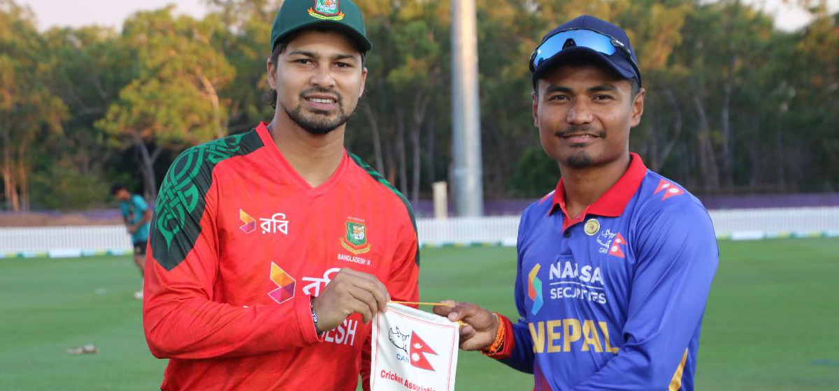 काठमाडाैं । टप इन्ड टी–२० विश्वकप छनोटको तयारीमा रहेको नेपाली राष्ट्रिय टोली आज अस्ट्रेलियामा बांग्लादेश ‘ए’सँग प्रतिस्पर्धा गरिरहेको छ। खेल नर्दन टेरिटोरीमा जारी टप एण्ड टी–२० सिरिजअन्तर्गत दोस्रो खेल हो।