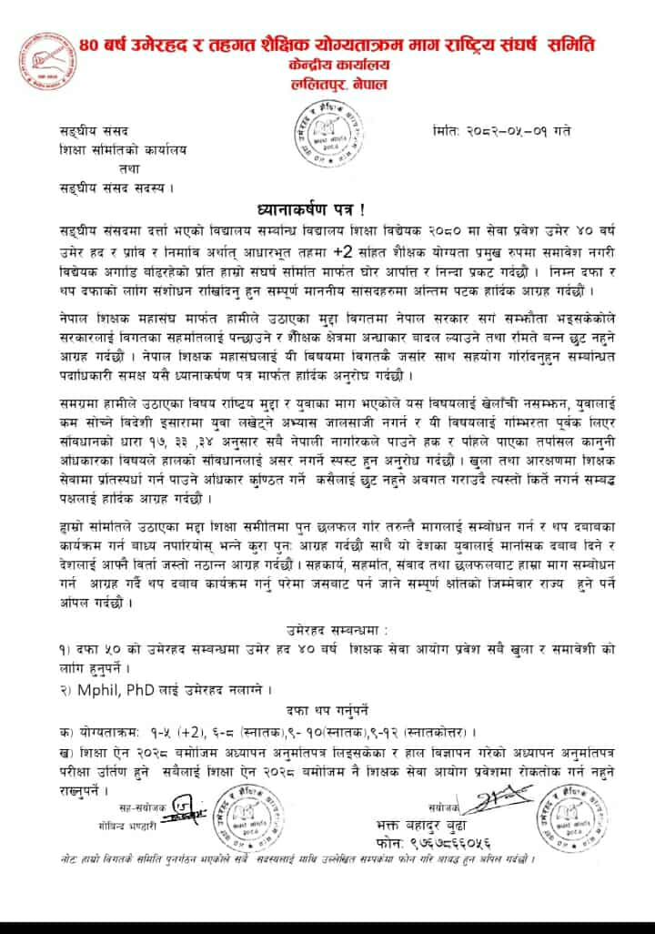 समितिका संयोजक भक्तबहादुर बुढा र सह–संयोजक गोविन्द भण्डारीले बुझाएको ध्यानाकर्षण पत्रमा शिक्षक सेवामा प्रवेश उमेर सीमा ४० वर्ष कायम गर्नुपर्ने र तहअनुसार शैक्षिक योग्यताको प्रावधान स्पष्ट गर्नुपर्ने उल्लेख छ। विशेषगरी आधारभूत तह (प्रावि र निमावि) मा प्लस–२ अनिवार्य योग्यता निर्धारण नगरी विधेयक अघि बढाइएकोमा समितिले आपत्ति जनाएको छ।