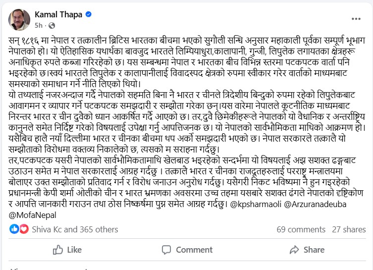 थापाले उल्लेख गरेका छन् कि नेपालको सहमतिविना भारत र चीनले त्रिपक्षीय सीमाविन्दु लिपुलेकमार्ग प्रयोग गरी आवतजावत र व्यापार सहज बनाउने समझदारी बारम्बार गर्दै आएका छन्। उनले यसलाई नेपालको सार्वभौमसत्तामाथि आपत्तिजनक हस्तक्षेप र आक्रमण भएको ठहर गरेका छन्।