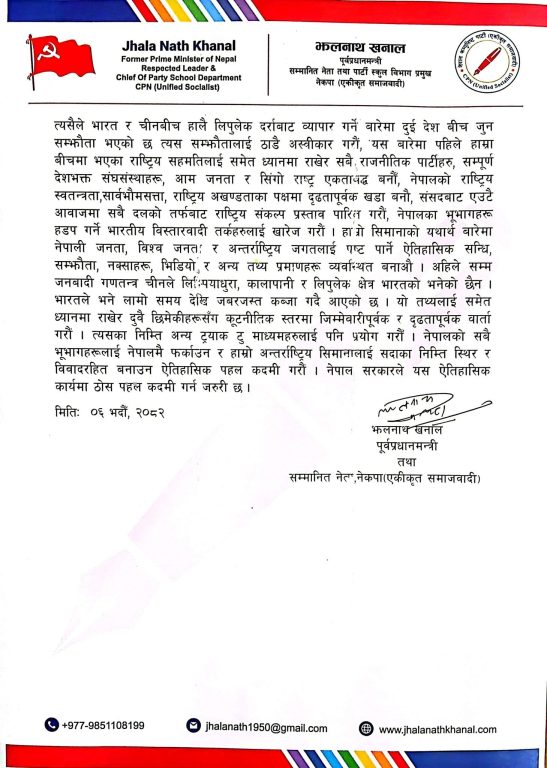 ‘भारतीय विस्तारवादी तर्कलाई खारेज गरौँ । नेपालको भू–भागबारे ऐतिहासिक सन्धि–सम्झौता, नक्सा, अभिलेख, भिडियो लगायतका प्रमाण व्यवस्थित गरी नेपाली जनता मात्र होइन विश्वसमक्ष स्पष्ट पारौँ,’ खनालले विज्ञप्तिमा भनेका छन् ।