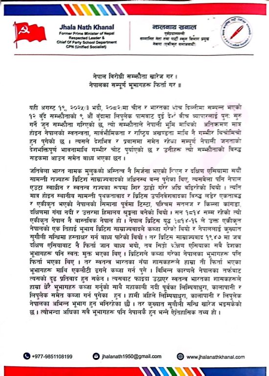 खनालले शुक्रबार जारी गरेको विज्ञप्तिमा दिल्लीमा सम्पन्न १२ बुँदे सम्झौतामध्ये ९औँ बुँदाले लिपुलेक मार्ग हुँदै भारत–चीन व्यापार पुनः सुरु गर्ने सहमति गरेको उल्लेख गर्दै यसलाई नेपालको सार्वभौमिकता, स्वतन्त्रता र राष्ट्रिय अखण्डतामाथि गम्भीर आघात भएको बताएका छन् ।